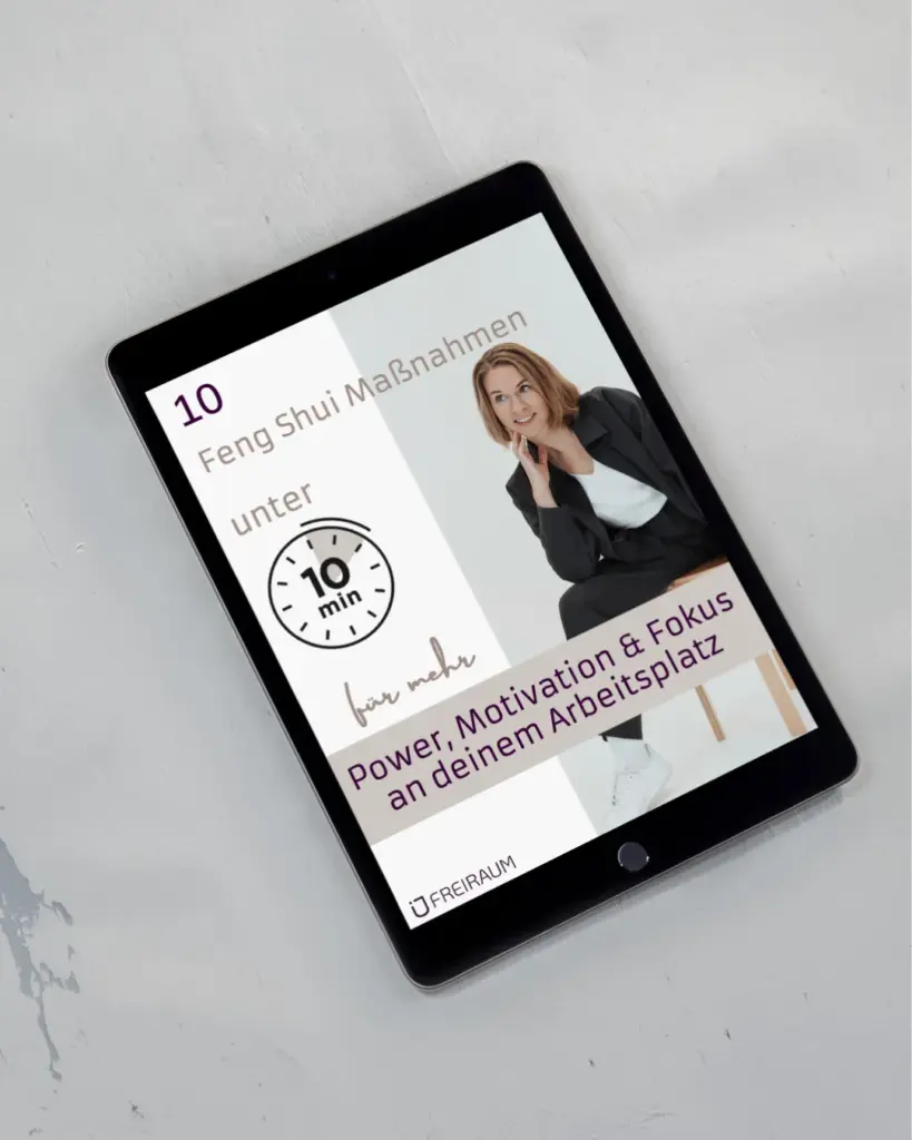 Dieses e-book für 0€ zeigt dir 10 Feng-Shui-Maßnahmen unter 10 Minuten, mit denen du an deinem Arbeitsplatz direkt mehr Power, Motivation & Fokus erreichst.